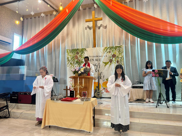 태국 북부에서는 차앙라이에 있는 아카족 교회인 '프라메따' 교회에서 추수감사절 예배를 드렸습니다. 우리 부부가 태국에 있었을 때는 매년 이 교회에 가서 추수감사절 예배를 드렸습니다. 교인들 거의 모두가 파인애플 농장을 가지고 있거나 아니면 농장에서 일을 하기 때문에 추수감사절의 의미가 남다른 것 같습니다. 강대상 아래에 많은 과일과 채소를 진열해 놓았는데 그중에는 살아있는 닭도 끼어 있었습니다. ^^
