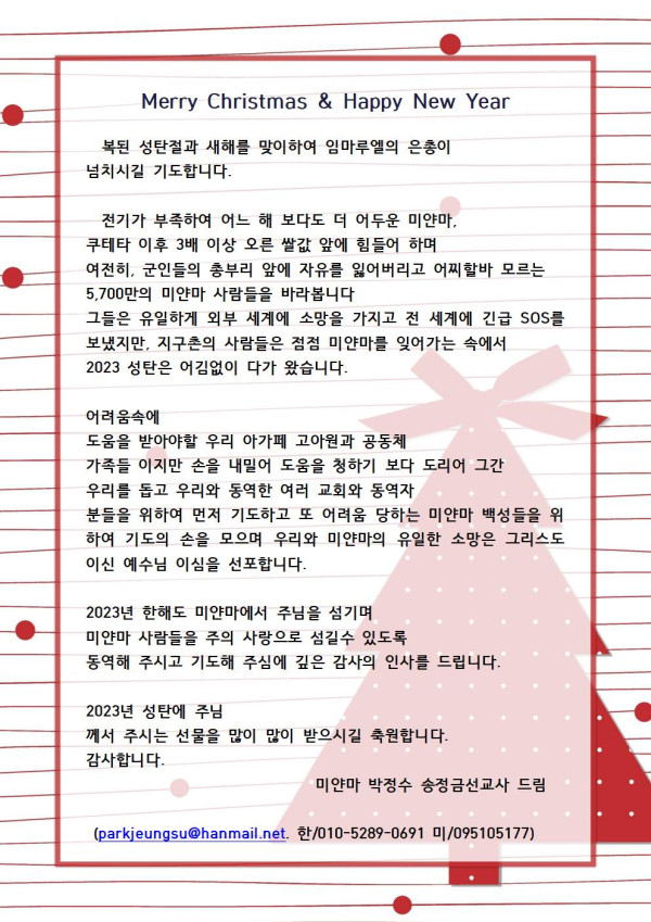 미얀마 12월 선교 소식 페이지 정보 작성자 늘푸른교회 댓글 0건 조회 1,133회 작성일 23-12-23 21:20 목록 본문 미얀마 이전글2024 새해인사 24.01.06 다음글11302023 선교소식 23.12.05 댓글 0 댓글목록 등록된 댓글이 없습니다. 목록