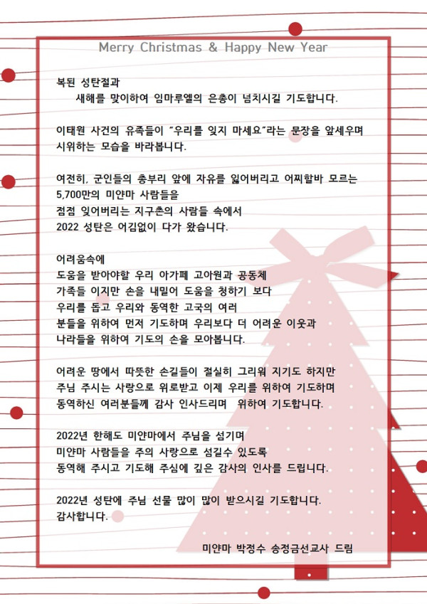 미얀마 2022 성탄절 선교 편지 페이지 정보 작성자 늘푸른교회 댓글 0건 조회 1,811회 작성일 22-12-25 20:56 목록 본문 2022 성탄절 선교 편지 이전글선교 사진 23.01.22 다음글선교 소식 22.12.05 댓글 0 댓글목록 등록된 댓글이 없습니다. 목록
