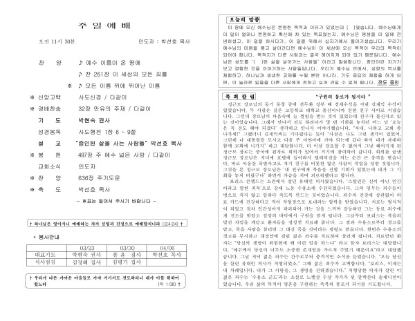 20250323 교회 주보 페이지 정보 작성자 늘푸른교회 댓글 0건 조회 728회 작성일 25-03-23 19:54 목록 본문 교회 주보 이전글20250330 교회 주보 25.03.29 다음글20250316 교회 주보 25.03.15 댓글 0 댓글목록 등록된 댓글이 없습니다. 목록