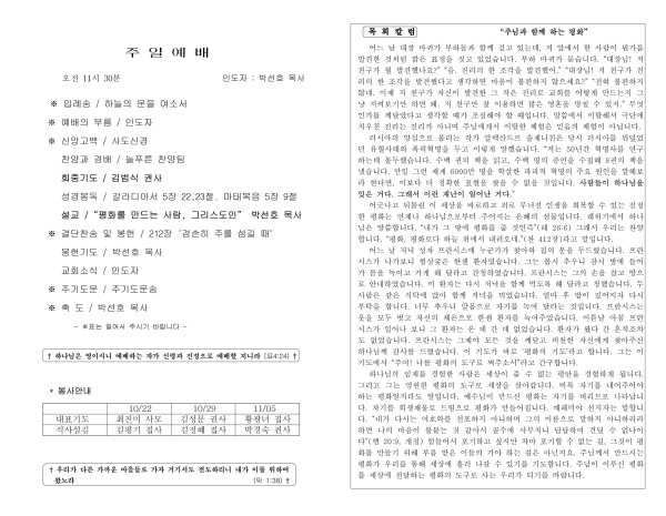 10152023 교회 주보 페이지 정보 작성자 늘푸른교회 댓글 0건 조회 1,605회 작성일 23-10-16 20:37 목록 본문 교회 주보 이전글10222023 교회 주보 23.11.20 다음글10082023 교회 주보 23.10.09 댓글 0 댓글목록 등록된 댓글이 없습니다. 목록