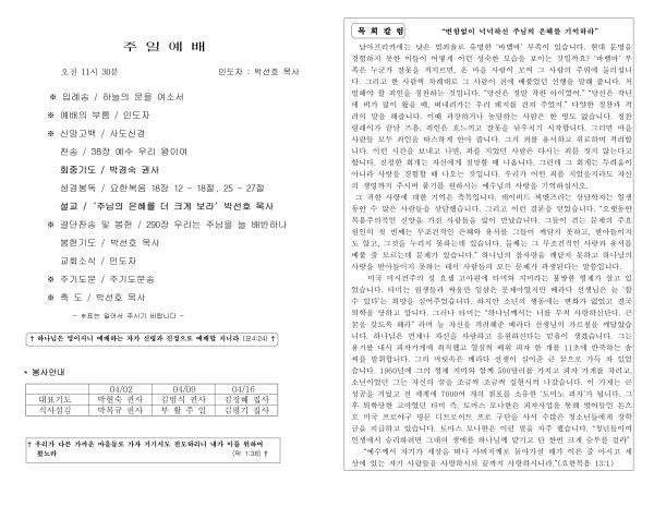 03262023 페이지 정보 작성자 늘푸른교회 댓글 0건 조회 1,606회 작성일 23-03-26 20:50 목록 본문 교회 주보 이전글04022023 교회 주보 23.04.02 다음글03192023 23.03.20 댓글 0 댓글목록 등록된 댓글이 없습니다. 목록