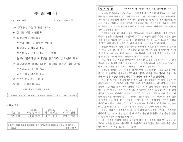 5월 22일 교회 주보 페이지 정보 작성자 늘푸른교회 댓글 0건 조회 1,613회 작성일 22-05-21 20:57 목록 본문 교회 주보 이전글5월 29일 교회 주보 22.05.29 다음글5월 15일 교회 주보 22.05.17 댓글 0 댓글목록 등록된 댓글이 없습니다. 목록